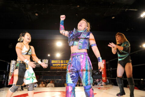 続く第二試合では噂の旧姓・AKINOが登場!試合前の屈伸運動から見せるAKINOそのままの動きに会場は大爆笑となりましたが、災難にもこれに巻き込まれたのが堀田・アジャ・高瀬の三選手。最終的に旧姓・AKINOはアジャの一斗缶による”狙い澄ました誤爆”の後、高瀬のダイビングギロチンでマットに沈みました。そして第三試合、注目の尾崎魔弓vs万喜なつみ。先制攻撃で奇襲をしかけた万喜でしたが、ポリスを帯同した尾崎はいつも通り、いやいつも以上の大暴れ。しかし万喜もそのポリスを撃退し、尾崎を追い詰めるなど健闘を見せます!ただ最後はやはり経験の差か、尾崎が裏拳の後に万喜をカウントツーで引き起こすなどのいたぶりを見せた後、さらにとどめの裏拳で勝利を奪いました。