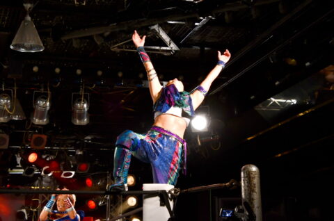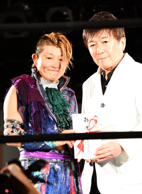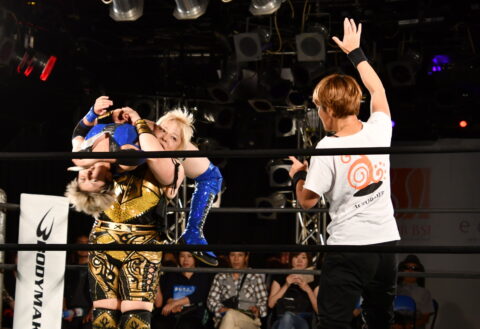 今回は何と黒田アーサーさんや元DA PUMPのYUKINARIさん、X-GUNのさがね正裕さんなどもおいでいただき、超満員の会場に華を添えていただきました! そんな中始まった第一試合、OZ初登場の真栄田ミサキ、松本浩代相手に気迫では一歩も引かない好ファイトを繰り広げます! 必死の丸め込み連発も見せ、まさかの金星の期待も高まりましたがそこは松本浩代。全体重を乗せたリバーススプラッシュ式ダブルニーで真栄田ミサキを撃沈しました。