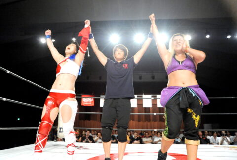 そしてメインイベント、獣友からのアジャ・コング&米山香織を迎え撃つのは、「仲が悪いのに強いときは強い」志田光&山下りな。こちらもチームワークで劣る志田&山下組ですが、互いに罵り合いながらも後半になればなるほど何故か足並みが揃い、米山のスピードとアジャの猛攻をしのぎ切っての志田の魂のスリーカウントが炸裂! 王者が盤石の勝利を収める結果となりました。
