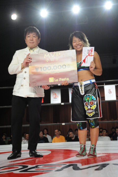 激闘の続く無差別級次期挑戦者決定変則トーナメント、Bブロックの3試合は何とMission K4が3タテでラストウーマン進出! 切れ味抜群のアキアンプロイダーでAKINOがAlex Leeから勝利を収めれば、加藤園子は執念の粘りを見せる希月あおいを必殺のクーロンズゲートで3カウント! そして小林香萌はこの日のための新必殺技・120%トルティージャ(コルパタからの120%スクールボーイ)で倉垣翼から大金星を挙げました!