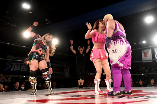 オープニングのくじ引きによりトーナメント準決勝は尾崎vs雪妃と加藤vs米山の組み合わせに決定。一試合目の正危軍対決は権力でセコンドを使いこなした尾崎が毒霧一閃、雪妃を3カウントに丸め込みました。そして加藤vs米山の一戦、米山は終始独特のペースで加藤を撹乱、力でそれを跳ね返そうとする加藤の一瞬の隙きを突いたエビ固めで決勝進出を掴み取ります。これによりマジテントーナメントの決勝は尾崎魔弓vs米山香織に決定!4月後楽園で志田光に挑戦するのは果たしてどちらの選手になるのでしょうか!