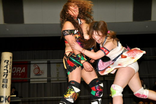 第一試合ではデビュー2ヶ月のアイスリボンの鈴季すずが、松本浩代を相手に一歩も引かぬ勢いのあるファイトを見せます。松本もこれに応えて鈴季の全てを受け止め、全力で叩き返す厳しい洗礼!最後は拷問逆エビとも言えるような厳しい攻めで鈴季からタップを奪いました。