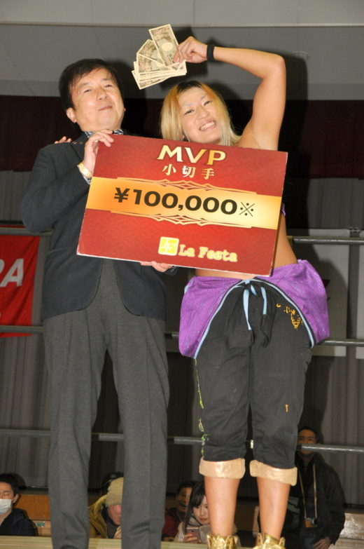 第三試合、本日も元気いっぱいの青木いつ希ですが、雪妃魔矢とセコンド桜花由美のこれでかというムチ攻撃に苦しめられます。それでも一瞬のすきを突いては逆転を狙うのですが、やはり多勢に無勢、素手にムチ。正危軍・雪妃魔矢の牙城を崩すには至りませんでした。