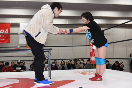 オープニングマッチを飾ったアイスリボンの宮城もちvs朝陽のお二人。安定の戦いを見せる宮城に対し、地元群馬出身・朝陽のガムシャラなファイトが光ります。倒されても倒されても向かっていく朝陽でしたが、ラストはもちがリバーススプラッシュを三連発!貫禄を見せつけての勝利を収めました。