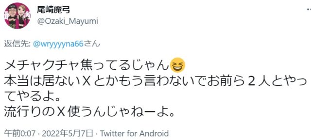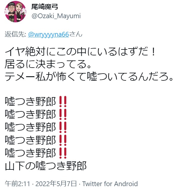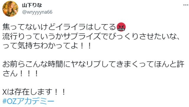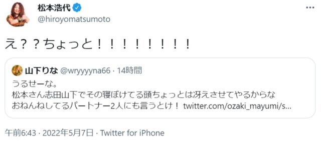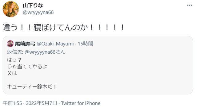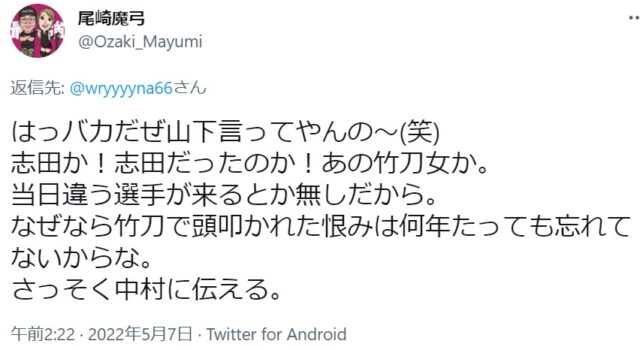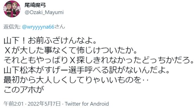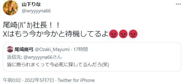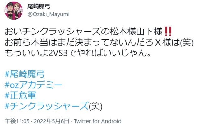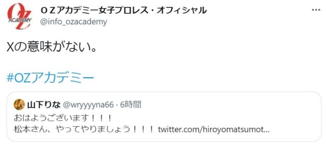 OZアカデミー5月新宿大会を翌々日に控えた昨夜、メインイベントの6人タッグマッチ「尾崎魔弓&雪妃魔矢&安納サオリ vs 松本浩代&山下りな&X」に参戦する「X」をめぐり、Twitter上で尾崎魔弓と山下りなが舌戦を繰り広げました。