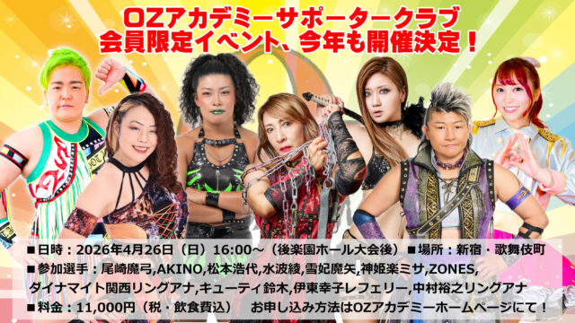 OZアカデミーサポータークラブ会員の皆さま、そしてこれからサポーターズクラブに入ろうとお考えの皆様、お待たせいたしました!昨年に続き、今年も春の大場所4.26後楽園大会の終了後、サポータークラブ会員限定のファンイベントの開催が決定いたしました!